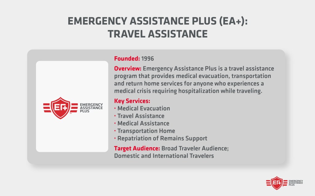 Emergency Assistance Plus was founded in 1996 and boasts an accredited A+ rating from the Better Business Bureau. EA+ has protected over 2 million travelers, providing them with emergency medical transportation, security, and travel assistance services. The services are provided 24 hours a day, 365 days a year, in coordination with a network of air ambulance transport companies, dedicated Global Response center representatives, and in-house medical teams.