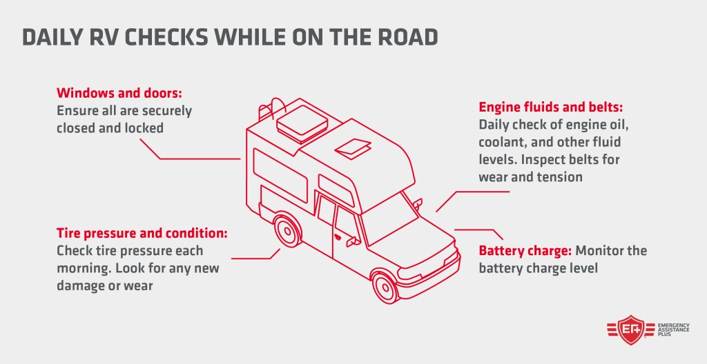 Conduct daily inspections before you set out to ensure your RV is in good condition. Check tires (even if you have a tire monitoring system), brakes, lights, oil level, and all systems for any issues. Attend to any minor issues as they arise, preventing them from turning into major problems.