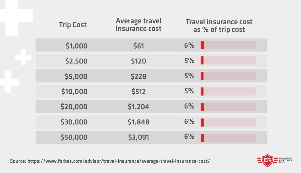 The cost of travel insurance fluctuates depending on the cost of the trip. Here are some average travel insurance costs expressed as a percentage of the total trip costs so you can get an idea of what you might pay: